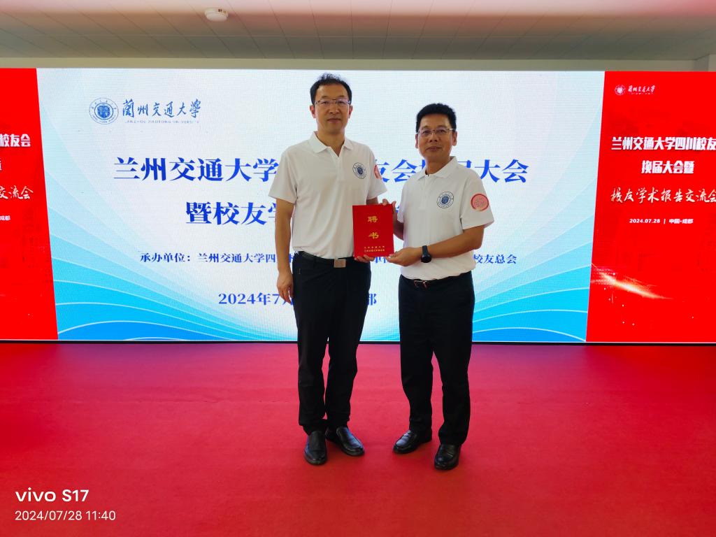 会议宣读了《关于兰州交通大学四川校友会换届申请的批复》,为新一届四川校友会理事会成员颁发聘书,为四川校友会授予校旗、会旗。