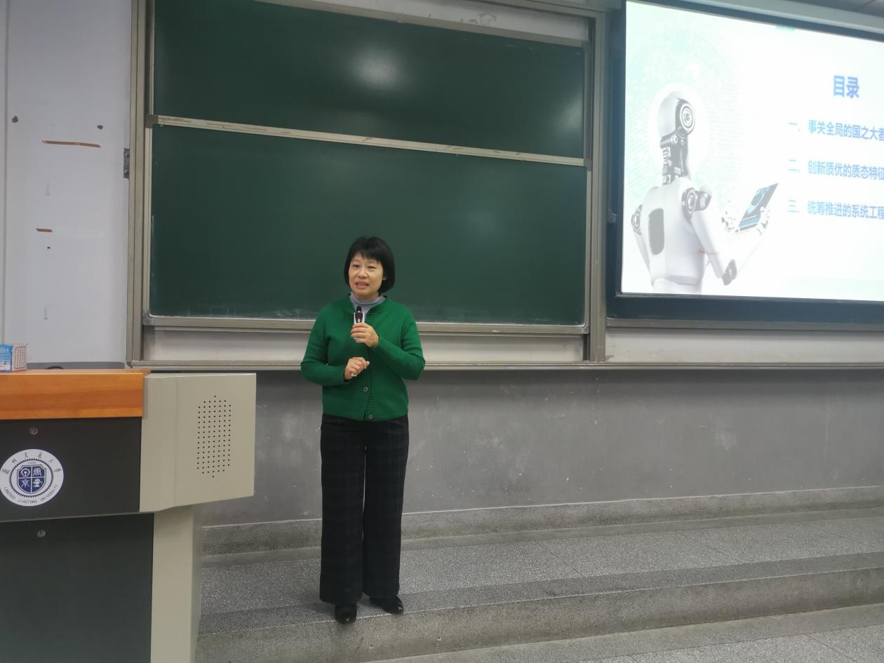授课过程中,聂磊紧密结合社会发展热点和学生成长实际,从人工智能技术影响人们的生活为切口,深入浅出地剖析了人工智能如何深刻地改变着我们的生产方式、生活方式乃至思维方式。引导学生们深入思考:“为什么必须发展新质生产力?怎样全面准确理解新质生产力的内涵特征?加快发展新质生产力面临哪些机遇和挑战?”详细论述了加快发展新质生产力是事关全局的国之大者,是统筹推进的系统工程。从技术革命性突破、生产要素创新性配置、产业深度转型升级等方面指出新质生产力以全要素生产率大幅提升为核心标志,具有高科技、高效能、高质量特征。她强调,面对未来发展方向,我们必须加快基础研究步伐,推动物质世界、精神世界与数字世界的深度融合与协同发展。推动教育、科技、人才建设协同发力,不断探索未知领域,推动科技进步。