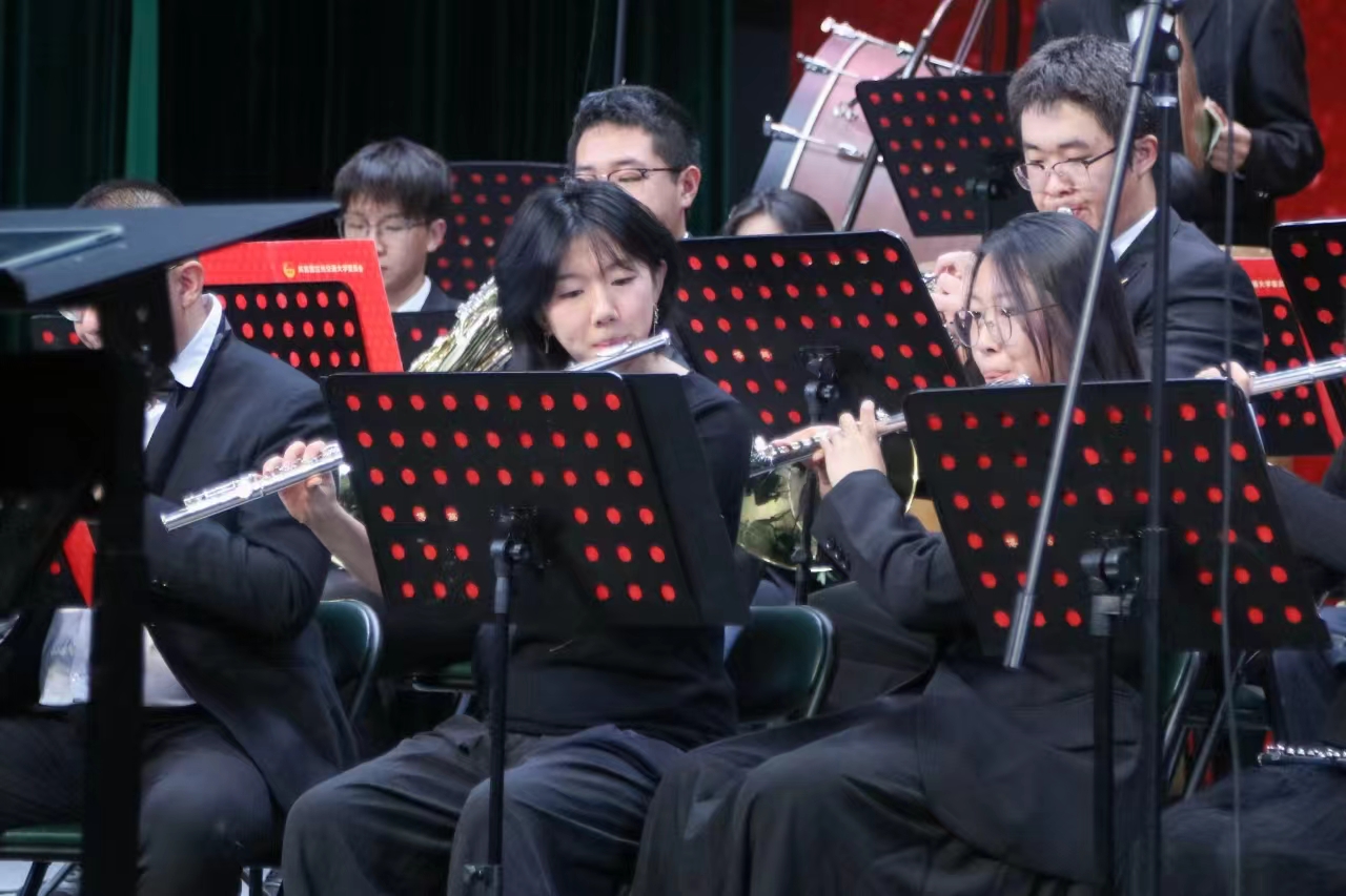 音乐会以一曲《红旗颂》开启序幕,激昂的旋律唤醒了心中对革命先辈的无限敬仰。《红色娘子军》展现了巾帼风采,那是一种历尽千辛万苦终得曙光的喜悦与自豪。承载着特定的历史记忆和情感共鸣的《唱支山歌给党听》深情表达了广大民众对中国共产党的真挚感激与无比信任,让师生共同感受到了那份跨越时空的忠诚与热爱。二胡协奏曲《红梅赞》赞颂了革命女英雄的崇高品质和坚定信念,如冬日寒梅般的坚韧与牺牲永存。象征着新生的《凤凰序曲》随着小号、定音鼓和长笛的交织穿插,随着音乐中所蕴含的巨大能量,寓意着新中国在硝烟和战火中涅槃重生。热情欢快、激情四溢的《青春之舞》彰显着各族儿女携手并进、共同建设新中国的热情与活力。一曲《天路》则将青藏铁路建设和兰州交通大学的发展连接起来,仿佛在讲述着兰州交大人在建设祖国的洪流中的奋斗故事。《珠穆朗玛》捕捉了地球上最高的珠穆朗玛峰的壮丽和雄伟,抒发着中华民族勇攀高峰,挑战极限的勇气与豪迈。随着《灯火里的中国》缓缓响起,从人民群众眼中眺望万家灯火,展现灯火里的美好生活、奋发图强和生生不息。“你是我心中最美的云彩,让我用心把你留下来”,交响乐版《最炫民族风》通过高雅与通俗音乐融合、流行与严肃音乐混搭,最熟悉的旋律带来最厚重的味道。一曲振奋人心的《展望未来》将全场气氛推向高潮,鼓舞着每一个人为实现中华民族伟大复兴的中国梦而不懈努力。《五声神韵》作为谢幕之曲,集合了多首风格迥异且极具民族特色的各民族音乐的精华,充分展现了中国文化的自信与自强。整场音乐会气氛热烈,高潮迭起。“五星红旗迎风飘扬,胜利歌声多么响亮!”伴随着全场齐声高唱《歌唱祖国》,音乐会落下帷幕。