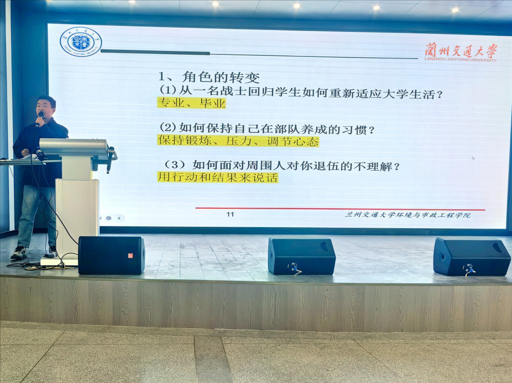 给排水科学与工程2012班退伍大学生和新入职辅导员结合本人应征入伍的经历和收获感想作分享发言。他们讲述了参军的故事、分享了退役复学后如何转变角色的心路历程,同时对大学生参军入伍的优待政策做了全面宣讲,鼓励同学们勇于挑战自我,通过参军入伍做有为的新时代好青年。