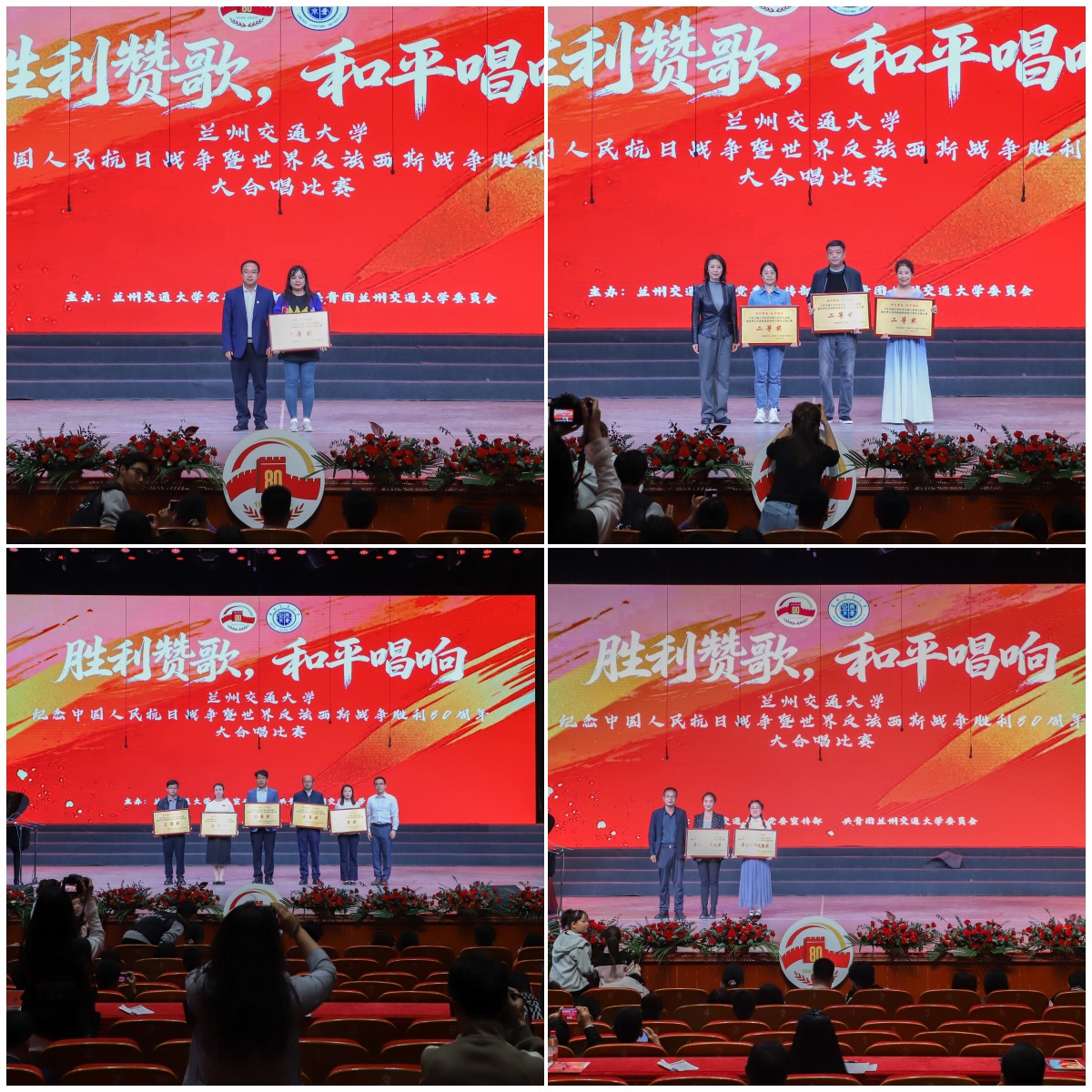 为铭记历史、缅怀先烈、珍爱和平、开创未来,9月27日晚19点,兰州交通大学“胜利赞歌,和平唱响”纪念中国人民抗日战争暨世界反法西斯战争胜利80周年大合唱比赛在学校大礼堂隆重举行。校党委常委、副校长苏程、陈喜春,校长助理吴亦政出席比赛现场。相关职能部处主要负责人,各学院党委负责人、学生工作负责人,附属中学、附属小学主要负责人,各学院团委书记及学生代表等共计1000余人观看比赛。